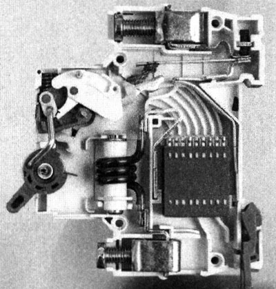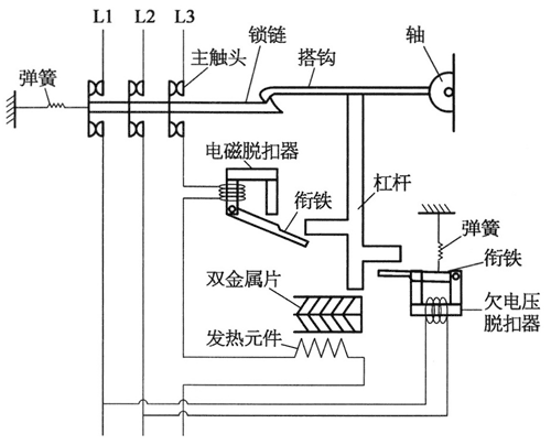 断路器的电路切断功能是通过“脱扣”来实现的。如图 17 所示,常见的断路器在过载和短路时会自动实现“脱扣”来保护电路,有些也具有欠压保护功能。其内部原理图如图 18 所示,当家用电路发生非严重的过载时,较大的电流使发热元件产生一定热量,促使双金属片受热向上弯曲,推动杠杆使搭钧与锁扣脱开,将主触头分离,切断电源。当家用电路发生短路或严重电流过载时,短路电流能使得电磁脱扣器产生足够大的吸力,在短时间内(一般小于 0.1 s)将衔铁吸合并撞击杠杆,切断电源。当电路出现欠压时,欠压脱扣器无法吸住衔铁,使衔铁被弹簧拉起,撞击杠杆,切断电源。在实际的断路器中,还存在灭弧室,因为自动断开开关的时候,会有一个电弧的产生,电弧因磁、热等作用引入灭弧室后被分割为多段,很快冷却、熄灭,电流彻底中断。常见的家用断路器,因为以空气作为灭弧介质,故又称“空气开关”。其他类型的断路器还有真空断路器、油断路器等。