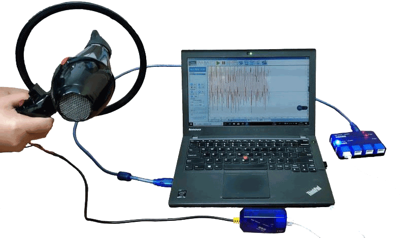 电吹风机中的电动机工作时会发出微弱的电磁辐射。线圈与微电流传感器组成闭合回路,通过计算机显示感应电流的大小。手握冷风挡的电吹风机,将其置于环形线圈中间,开启电源,调整电吹风机的位置使计算机屏幕上出现的波形最大。