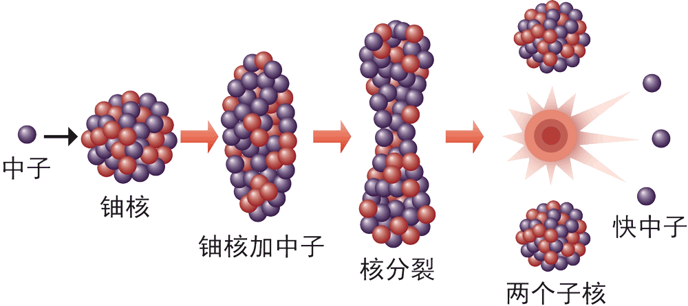 1939 年,物理学家发现用中子轰击铀 核时铀核分裂成几个其他原子核,同时释放出能量。较重的原子核分裂成几个较轻的原子核的过程叫做核裂变(图 12–7)。 一个铀 235 核裂变可释放约 200 MeV 能量(eV 是能量单位,称为“电子伏特”, 1 eV = 1.6×10−19 J,1 MeV = 106 eV)。若有足够数量的铀核裂变且能持续进行,那么,所释放的能量就能为人类所用。