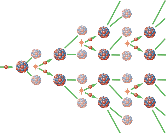 如图 12–9 所示,铀核受中子轰击而发生裂变时能放出 2 ~ 3 个中子和一定的能量。这 2 ~ 3 个中子又迅速引起周围其他铀核的裂变,这就使裂变迅速扩大,释放出越来越多的能量。这种反应过程的产物可以引起随后的反应,因而使这种反应一经开始就能自动持续进行的反应过程叫做链式反应。链式反应能够迅速释放巨大的核能。