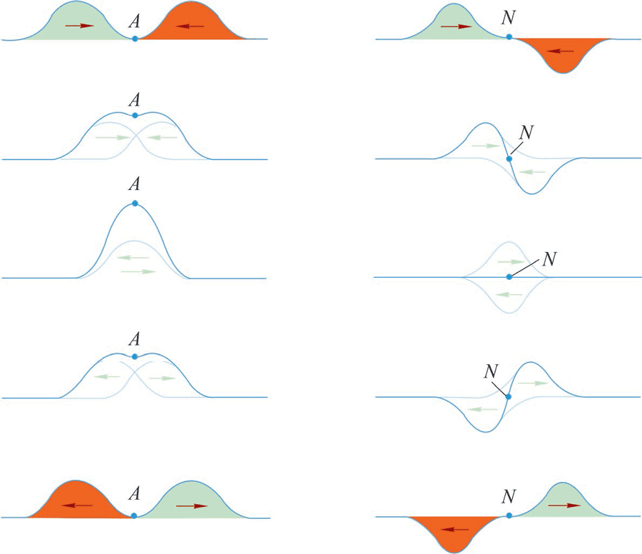 图 3–25 中绳上的质点 A 和 N 在两列波相遇时同时受到了两列波的影响。在相遇之后两波继续按相遇前的规律传播。