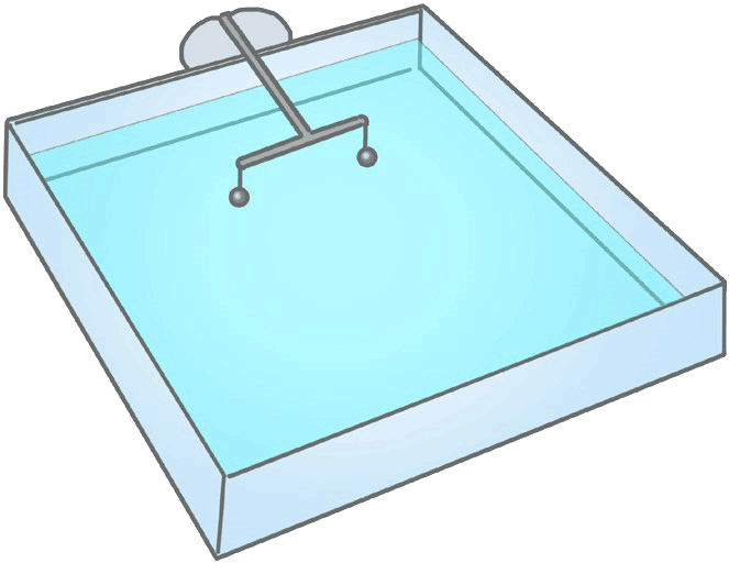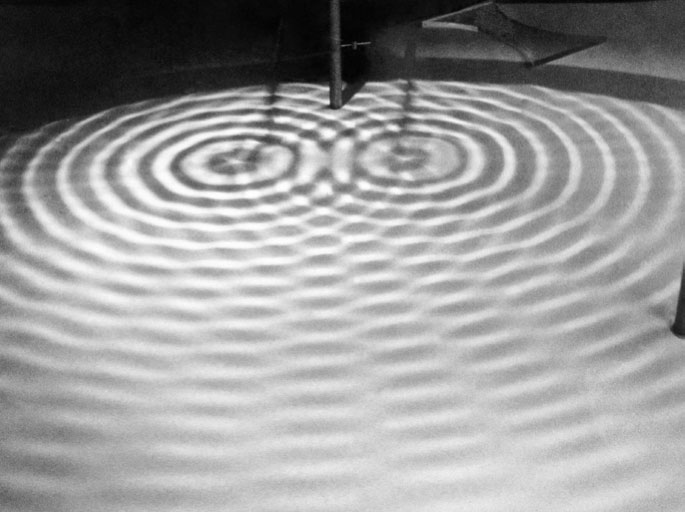 利用如图 3–27(a)所示的实验装置可以观察到两列完全相同的水波互相叠加的现象。固定在同一振动架上的两个小球,周期性地触动水面,形成两列频率相同的水波。这两列水波相遇后,在它们重叠的区域内出现了如图 3–27(b)所示的现象。