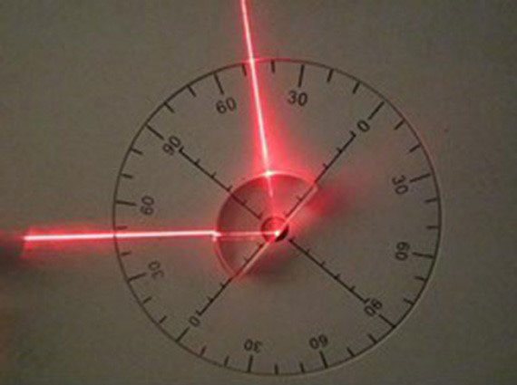 如图 4–12 所示,激光束沿着半圆柱形玻璃砖的半径射到它的平直面上,光在玻璃与空气的界面上同时发生反射与折射。逐渐增大入射角,观察反射光和折射光如何变化。