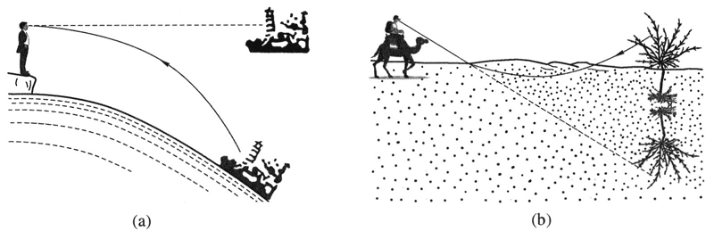 “海市蜃楼”也叫“蜃景”,是光在密度和折射率随高度连续变化的大气中传擂时,因为折射和全反射产生的现象。例如,夏天,海平面上的下层空气温度比上层低,密度比上层大,折射率也比上层大,且地球表面存在曲率。站在海边的观察者不能直接看见其视线以下远处的景物,从远处景物射向空中的光,因从光密介质向光疏介质传播,会在大气中连续发生折射,直至被全反射回地面。如果光正好进入眺望远方的观察者眼中,观察者就会看到远处景物悬在空中的“虚像”[图8(a)]。再如,沙漠里,太阳照到沙地上,接近沙地表面的热空气层比上层空气的密度小、折射率小。从远方景物射向地面的光,同样因为从光密介质向光疏介质传播,会在大气中连续发生折射,直至被全反射而逐渐远离地面。如果光线正好进入人的眼中,就会在远处的地面上看到景物倒立的“虚像”[图8(b)],仿佛远处有水面而发生了反射。沙漠里的行人常被这种景象所迷惑,以为前方有水源而奔向前去,却总是可望而不可及。