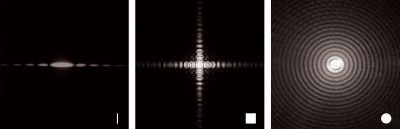 - 如图 4–58(a)所示为光分别通过狭缝、正方形孔与圆孔后产生的衍射图样(缝和孔的形状标于各图的右下方)。当光通过正六边形孔时,会在光屏上产生如图 4–58(b)所示的衍射图样。根据图(a)中提供的信息,分析说明产生图(b)衍射图样的原因。