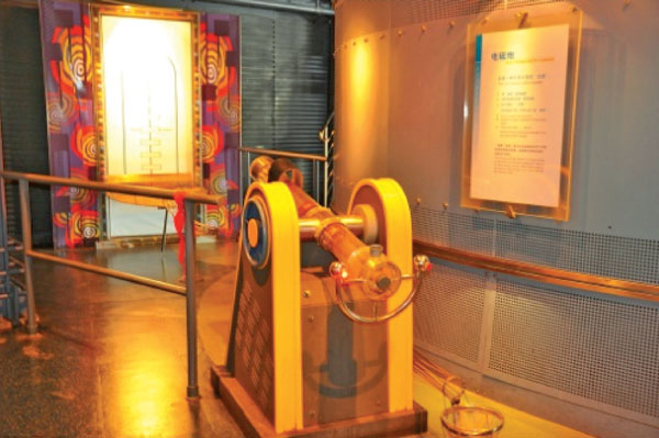 上海科技馆的智慧之光展区有一个叫做“电磁炮”的体验展品,如图 5–1 所示。“炮弹”是一个金属球。当你按下按钮,“炮弹”就会从炮筒中射出,根据“炮弹”击中“目标靶”的情况在屏幕上显示你的得分。