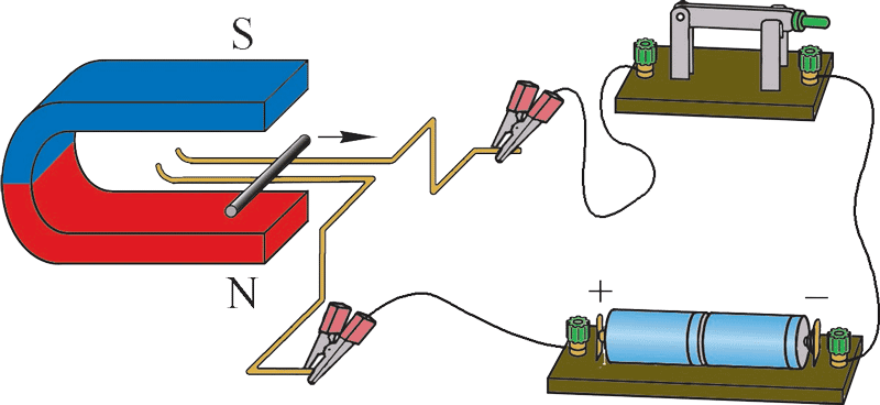 在蹄形磁体的两极之间放置一对平行导轨;导轨两端接在电源上,在两导轨之间垂直于导轨放置一段电阻较小的导体棒。闭合开关,使导体棒通电,观察导体棒的运动情况(图 5–2)。