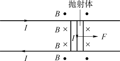 传统的化学能火炮在发射过程中,后部的火药被点燃,造成气体体积迅速膨胀,推动弹体在炮膛里加速前进。传统的化学能火炮的射程受到出膛速度的限制。电磁炮是利用电磁系统中磁场产生的安培力来对抛射体(金属炮弹)加速,使其获得打击目标所需的动能。与传统的化学能火炮相比,电磁发射可大大提高炮弹的出膛速度和射程。电磁炮的基本原理如图 5–13 所示,抛射体与导轨有良好的电接触,并与电源连接,构成回路。通过给导轨回路通以很大的电流,可使抛射体在导轨电流产生的磁场的安培力作用下沿导轨加速运动,最终以很高的速度将抛射体发射出去。