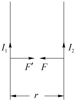 方向垂直导线向左。同理可知,通电直导线 I2 在其周围距离为 r 处的各点,磁感应强度的大小均为 B2 = km \(\frac{{{I_2}}}{r}\),左边直导线 I1 受到的安培力大小为