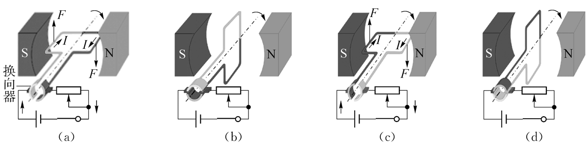 直流电动机是将直流电能转换为机械能的动力机械。直流电动机最突出的优点是通过改变输入电压很容易调节它的转速。因此,不少需调速的设备都采用直流电电动机。直流电动机原理如图 4(a)和图 4(c)所示。当直流电源通过电刷向线圈供电时,左侧导体受到向上安培力的作用;右侧导体受到向下安培力的作用。换向器是一对相互绝缘的半圆形接触片且通过电刷与直流电源连接。通过换向器,通电线圈便可以连续不断地按顺时针旋转,将输入的直流电能转换成输出的机械能。