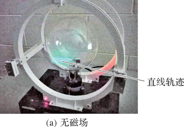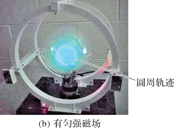 通过调节洛伦兹力演示仪(图 5–30)中励磁线圈电流的有无,分别观察在无磁场和有匀强磁场时电子束的运动径迹。