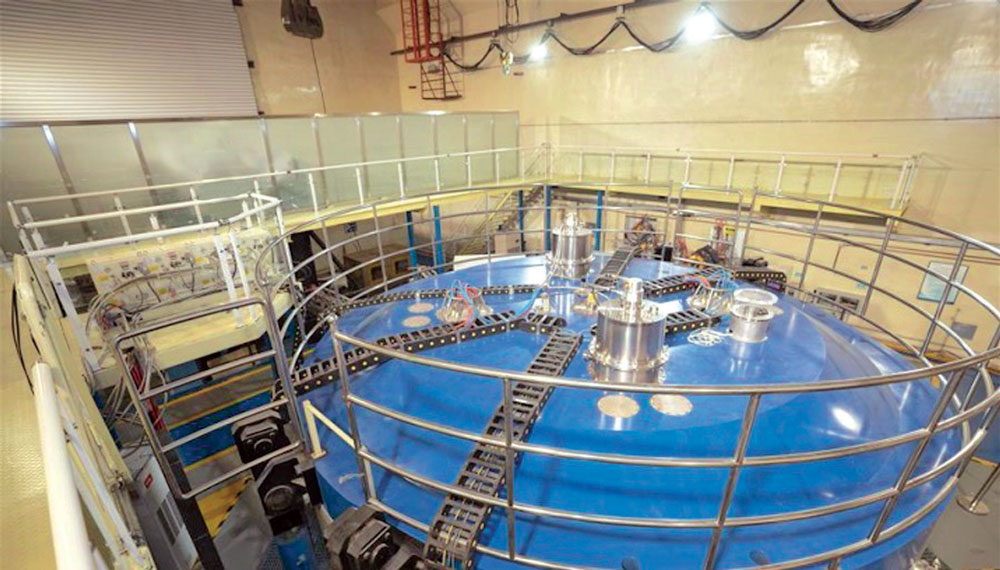如图 5–35 所示为中国原子能科学研究院自主研发的 100 MeV 质子回旋加速器。此回旋加速器可以调试出速度接近一半光速的质子束,这标志着我国回旋加速器达到国际同类装置的先进水平。现在回旋加速器已经获得广泛应用,例如可生产治疗癌症的同位素药物。作为放射线源,我国制造的紧凑型回旋加速器已在各地的医院里普遍使用。