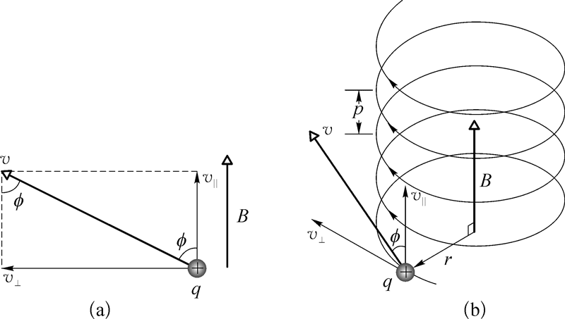 对于带电粒子的初速度 v 与匀强磁场的磁感应强度 B 成任一角度 ϕ 的情形,如图 10(a)所示,粒子的速度可分解成平行于 B 的分量 v‖ = vcosϕ 及垂直于 B 的分量 v⊥ = vsinϕ。如果只有垂直分量 v⊥,粒子将受到洛伦兹力的作用在垂直于磁场的平面内做匀速圆周运动,圆周半径 r = \(\frac{{m{v_ \bot }}}{{qB}}\);如果只有平行分量 v‖,粒子将不受洛伦兹力,因而沿磁场方向做匀速直线运动。这两方面运动合成的结果是粒子做如图 10(b)所示的等螺距螺旋运动,螺旋的螺距(即粒子在绕行一周的时间 T 内沿磁场方向运动的路程)p = v‖T = vcosϕ \(\frac{{2\pi m}}{{qB}}\)。