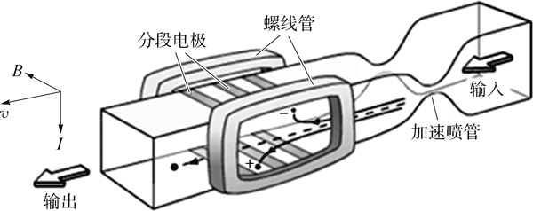 磁流体发电技术是一种新型的高效发电方式,由于无需经过机械转换环节,燃料利用效率显著提高。用燃料直接加热气体,使之在高温下电离成导电的离子流,然后让其在磁场中高速流动,在洛伦兹力作用下产生感应电动势,即由热能直接转换成电能。这种技术也称为等离子体发电。在几千摄氏度的高温下,这些物质中的原子和电子的运动都很剧烈,有些外层电子甚至可以脱离原子核的束缚,其结果使这些原子变成自由电子和失去电子的正离子,这就是等离子体。将等离子体以超音速的速度喷射到一个加有强磁场的管道里面,等离子体中带有正、负电荷的高速粒子在磁场中受到洛伦兹力的作用,分别向两极偏移,于是在两极之间产生电压,用导线接入电路中就可对外供电。磁流体发电本身的效率仅 20% 左右,但由于其排烟温度很高,从磁流体发电机排出的气体可送往一般锅炉继续燃烧成蒸汽驱动汽轮机发电,组成高效的联合循环发电,总的热效率可达 50% ~ 60%。