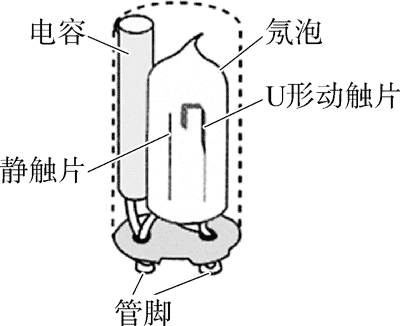 启动器由封在玻璃泡中的静触片和 U形动触片组成,玻璃泡中充有氖气。两个触片间加上一定的电压时,氖气导电以致发光和发热。动触片是用黏合在一起的双层金属片制成的,受热后两层金属的热膨胀不同,动触片稍稍伸开一些,和静触片接触,启动器不再发光,这时双金属片冷却,动触片形状复原,两个触点重新分开。实际使用的启动器中常有一个电容器并联在氖泡的两端,它能使两个触片在分离时不产生电火花,以免烧坏触点,同时还能减轻对附近无线电设备的干扰。没有电容器时启动器也能工作。