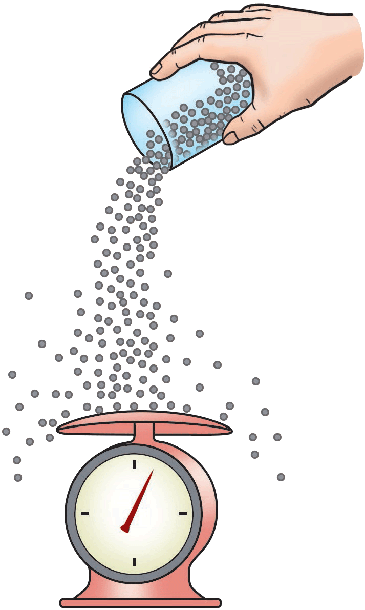 我们用下面的实验来模拟气体压强的产生。如图 11–4 所示,把台秤的托盘翻过来放置,将若干小钢珠(或黄豆)连续倒向托盘。小钢珠与托盘撞击后全部都被反弹开,但由于许多小钢珠不断地撞击托盘,托盘就受到一个持续的压力,台秤就会指示这一压力。