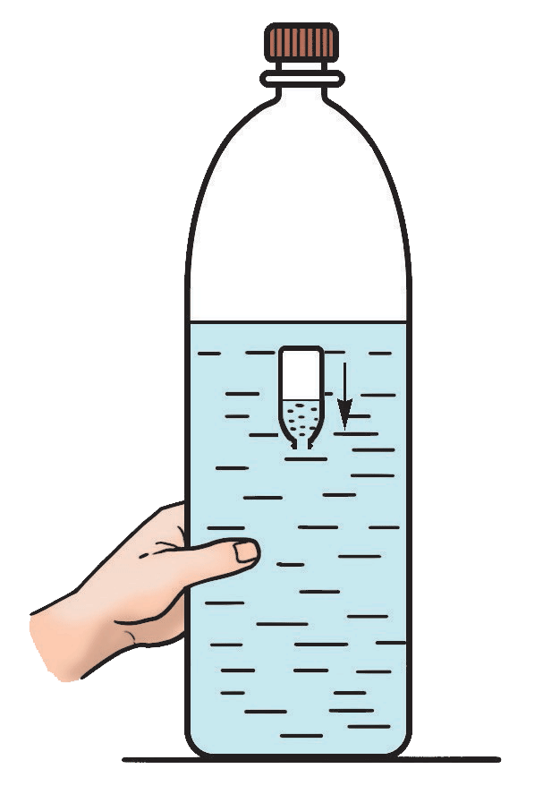 如图 11–8 所示,在一个大塑料瓶里装入大半瓶水,并放入一个倒扣的小瓶,小瓶内留有大约一半水,使其刚好浮出水面。拧紧大瓶的盖子,用力挤压大瓶,就可以看到小瓶下沉。这个装置叫做浮沉子。
