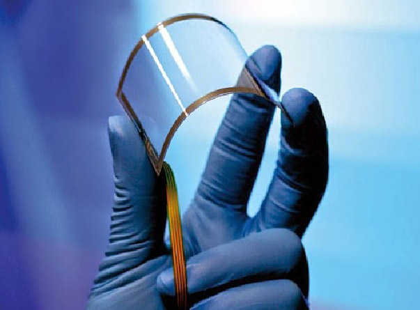 石墨烯是目前已发现的最轻、最薄但强度最大、导电性能最好的物质,它的厚度仅相当于人类头发丝的十万分之一,强度却可以达到钢铁的 200 多倍。石墨烯可广泛应用在电池电极材料、半导体器件、透明显示屏等方面。石墨烯制成的晶体管在接近单个原子的尺度上依然能稳定地工作,并且可以达到极高的工作频率。图 11–44 所示的是以石墨烯为基础材料制成的柔性显示屏,它是未来移动设备显示屏的发展方向。另外,石墨烯在新能源电池行业也有着广泛的应用前景。