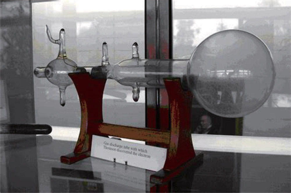1871 年,英国物理学家在实验中发现阴极射线在磁场中的偏转现象,因而提出阴极射线由带负电的粒子所组成。其中,克鲁克斯(W.Crookes,1832—1919)对阴极射线带电的原因给出了一种典型解释。他认为由于分子的热运动,放电管中一些残余气体的分子撞到阴极上,从阴极获得了负电荷,然后在电场的驱使下运动而形成了带负电的分子流。