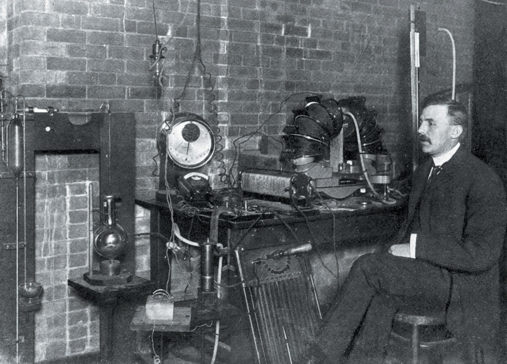 1908 年,卢瑟福(图 13–6)指导他的助手用高速飞行的 α 粒子轰击厚度为 0.4 μm 的金箔,希望通过 α 粒子运动路径发生偏转的程度研究靶原子(金原子)的结构。这个实验被称为 α 粒子散射实验。
