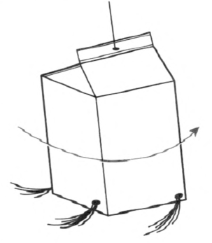 如果没有器材,“做一做”栏目中的第二个实验(教材图 1.6–2 乙)也可以改成“观察从牛奶盒中喷出的水流和纸盒的旋转”实验(图 1–5)。这两个实验涉及力矩和转动,解释时需要分两步走,水喷出时提供一个反作用力,根据初中知识或生活经验,两个方向相反又不在同一直线上的力可以使物体转动。