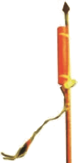 我国早在宋代就发明了火箭(图 1.6-3)。箭杆上捆了一个前端封闭的火药筒,点燃后生成的燃气以很大速度向后喷出,箭杆由于反冲而向前运动。