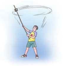 将一个以电池为电源的蜂鸣器固定在长竹竿的一端,闭合开关后听一听它发出的声音。请一位同学用竹竿把蜂鸣器举起并在头顶快速转动(图 3.5–1),在几米之外听它的声音有什么变化。