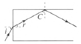 4.设当入射光线入射角为 i 时,进入端面的折射光线传到侧面时恰好发生全反射,如图 4–6 所示,则有 sin C = \(\dfrac{1}{n}\),n = \(\dfrac{\sin i}{\sin r}\),C + r = 90°。解以上各式的 sin i = \(\sqrt {{n^2} - 1} \),i = arcsin \(\sqrt {{n^2} - 1} \)。由于 n < \(\sqrt 2 \),所以 i < arcsin \(\sqrt {2 - 1} \),即 i < 90° 时光线就能传到另一端。