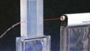 将塑料瓶下侧开一个小孔,瓶中灌入清水,水就从小孔流出。用激光水平射向塑料瓶小孔(图 4.2-10,激光可由激光笔产生),观察光的传播路径。