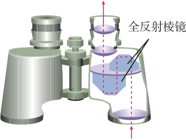 如图 4.2–4,玻璃棱镜的截面为等腰直角三角形,当光从图中所示的方向射入玻璃时,由于光的方向与玻璃面垂直,光线不发生偏折。但在玻璃内部,光射向玻璃与空气的界面时,入射角大于临界角,发生全反射。与平面镜相比,它的反射率高,几乎可达 100%。这种棱镜在光学仪器中可用来改变光的方向,应用十分广泛,例如图 4.2–5 所示的双筒望远镜中的全反射棱镜等。