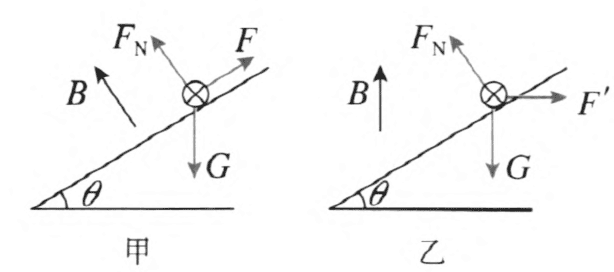 提示:(1)杆受力如图 1–5 甲所示,此时安培力 F 有最小值,磁感应强度 B 有最小值。由平衡条件可得 F = mgsinθ,即BI1l = mgsinθ,所以 B = \(\frac{{mg\sin \theta }}{{{ I_1}l}}\),方向垂直于导轨平面向上。