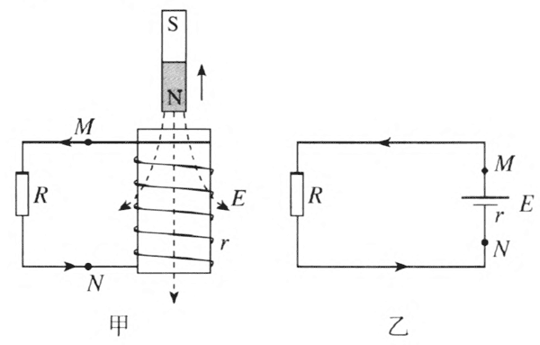 结合实例进行对比分析,对巩固和深化概念很有效。如图 2–2 甲所示,电路中的线圈相当于电源,其电动势为感应电动势,线圈导线的电阻相当于电源内阻,进而可画出如图 2–2 乙所示的电路图,以便学生类比掌习。
