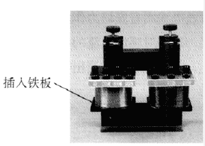 实验装置:如图 2–4 所示,在可拆变压器的条形铁芯下插入一块厚约 2 mm 的铁板,铁板垂直于铁芯里磁感线的方向。