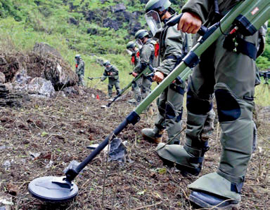 电流。如果地下埋着金属物品,金属中会感应出涡流,涡流的磁场反过来影响线圈中的电流,使仪器报警。这种探雷器可以用来探测金属壳的地雷或有较大金属零件的地雷。