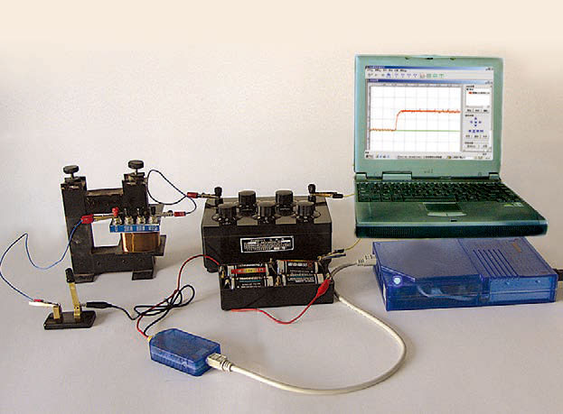 1.按图 2.4–4 甲连接电路(图 2.4–5 是实物连接图),可以看到,开关闭合时电流是逐渐增大的。为了说明这一点,可以拆掉线圈(图 2.4–4 乙)再测一次,看看两次测得的电流—时间图像有什么不同。