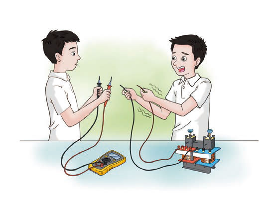 2.李辉用多用表的欧姆挡测量一个变压器线圈的电阻,以判断它是否断路。刘伟为了使李辉测量方便,没有注意操作的规范,用两手分别握住线圈裸露的两端让李辉测量。测量时表针摆过了一定角度,李辉由此确认线圈没有断路。正当李辉把多用表的表笔与被测线圈脱离时,刘伟突然惊叫起来,觉得有电击感(图 2.4–8)。李辉很奇怪,用手摸摸线圈两端,