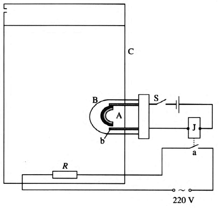 2.控制电路如图 5–3 所示,A 为调节后的 U 形双金属片,一端固定在金属杆上,另一端固定与金属丝 b 构成一对触点。将它密封在玻璃罩 B 内,成为温度传感器,浸入电热水器 C 的水中。J 为电磁继电器的线圈,a 为该继电器的常闭触点,R 为大功率电热元件。闭合开关 S,若水的温度低于 60 ℃,双金属片 A 与触点 b 分离,继电器触点 a 闭合,电热元件通电发热。当水温升高到 60 ℃ 时双金属片 A 因温度升高而与触点 b 接触,则触点 a 断开,加热电路断开,就停止对水的加热了。水温下降到 60 ℃ 以下时,A 与 b 又断开,触点 a 闭合,加热电路闭合再度给水加热。