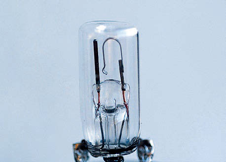 2.双金属温度传感器是将两种具有不同热膨胀系数的金属贴合在一起制成的。当它温度升高时,两种金属伸长不一样而发生弯曲变形,使触点接通或断开。日光灯启动器里就有一个双金属温度传感器(图 5.3–7)。取一个报废的日光灯启动器,去掉外壳,在充有氖气的玻璃泡内,有一个 U 形的双金属片,其旁边有一根直立的金属丝,两者构成一对触点。常温下两触点是分离的,温度升高时,双金属片因形变而与金属丝接触。