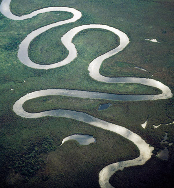 2.图 5.1–6 是从高空拍摄的一张地形照片,河水沿着弯弯曲曲的河床做曲线运动。图中哪些地方河水的速度方向跟箭头所指 P 处流水的