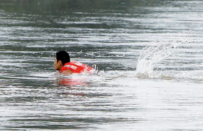 若人在河中始终保持头朝正前方游向对岸,你认为他会在对岸的正前方到达,还是会偏向上游或下游?为什么?