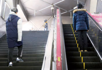 某商场设有步行楼梯和自动扶梯,步行楼梯每级的高度是 0.15 m,自动扶梯与水平面的夹角为 30°,自动扶梯前进的速度是 0.76 m/s。有甲、乙两位顾客,分别从自动扶梯和步行楼梯的起点同时上楼,甲在自动扶梯上站立不动,乙在步行楼梯上以每秒上两个台阶的速度匀速上楼(图 5.2–3)。哪位顾客先到达楼上?如果该楼层高 4.56 m,甲上楼用了多少时间?
