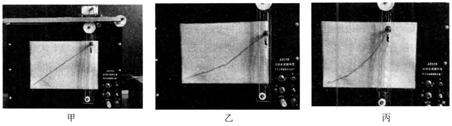 通过运动合成演示仪可以画出笔尖运动的三种轨迹(直线、折线和曲线)。运动合成演示仪的原实验装置中只有竖直方向电机可以调速,水平、竖直两个电机共用一个电源,速度可以连续变化的时间很短,这样就导致画出的曲线效果不埋想,因此要把实验装置稍加改进。将水平电机和竖直电机分别接两个独立的学生电源后,在转动竖直方向速度调节旋钮时不断改变两个电机所接电源的电压,这样就可以画出连续的曲线运动轨迹了。