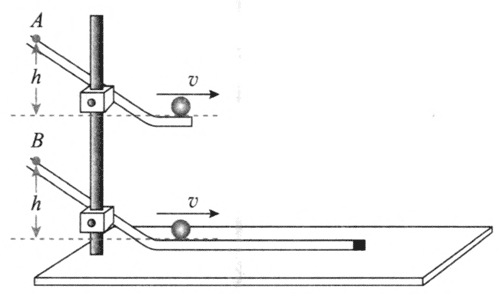 可以通过比较方法先研究水平方向的分运动特点。如图 5–19 所示,两相同小球分别从 A、B 处同时滚下,一球做平抛运动,另一球沿光滑的水平轨道运动。改变小球下滑时的高度,观察两球是否始终能够相碰。在此基础上,结合平抛运动的轨迹,获取相同时间间隔的竖直方向位移,就能够确定竖直方向的分运动是匀变速运动。如果再测出小球的水平分速度,就可以确定时间间隔的具体数值,从而得到竖直分运动的加速度值。
