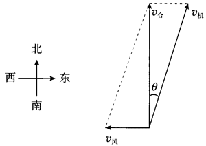由题意得 sinθ = \(\frac{{{v_风}}}{{{v_机}}}\) = \(\frac{54}{414}\) = \(\frac{2}{23}\),所以飞机应朝北偏东 θ 角的方向行驶。