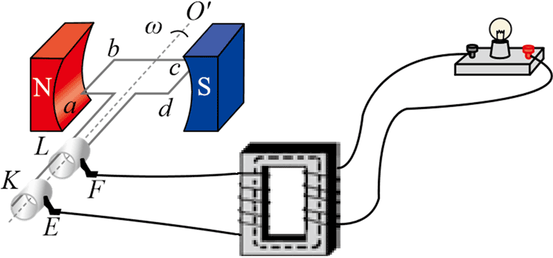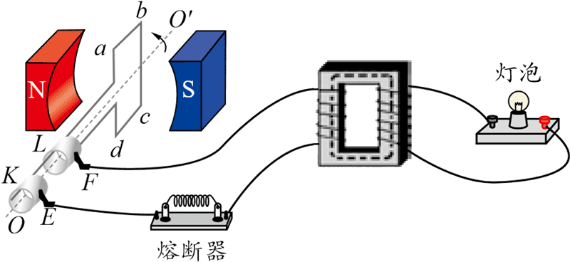 5.交流发电机模型如图所示。n = 100 匝的矩形闭合导线框 abcd 处于磁感应强度 B = \(\frac{{\sqrt 2 }}{{10\pi }}\) T 的水平匀强磁场中,线框面积 S = 0.48 m2。线框绕垂直于磁场的轴 OO′ 以角速度 ω = 50π rad/s 匀速转动,并与理想变压器相连,变压器副线圈接入一只额定电压12 V的灯泡,灯泡正常发光,线框、输电线路的电阻都不计。