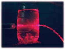 如图 4-32 所示,在暗室里放置一个容器,并在其侧面靠下的位置开一个小孔。在容器中装入水,水从容器的小孔自由流出。使一束细光束沿水平方向从小孔对面一侧射入水中,你会发现什么现象?
