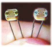 光敏电阻是用金属硫化物等半导体材料制成的。当光照射到这些半导体物质上时,会激发半导体内部受束缚的电子,其电阻值就会发生改变。光照越强,被激发的电子数就越多,电阻值就越小。不受光照射时,其电阻值是受光照射时的 100 ~ 1 000 倍。例如,某一型号的光敏电阻,受光照射时的阻值为 2 kΩ,不受光照射时的阻值为 1 000 kΩ。图 5-7 是一种光敏电阻。