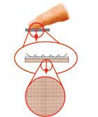有一种指纹识别器是通过电容传感器来识别指纹的。该传感器表面集合了 300×300 个电容器极板,其外面是绝缘表面。当用户的手指放在绝缘表面时,皮肤便组成了电容阵列极板的另一面,指纹的脊和谷相对于另一极之间的距离不同,使电容阵列中不同位置的电容器的电容值也不相同(图 5-18)。通过读取这些电容的差异,就能获取指纹信息。这样,把指纹的信息转换成了电信号,再经过电路对电信号的比较,便可实现对指纹的识别。