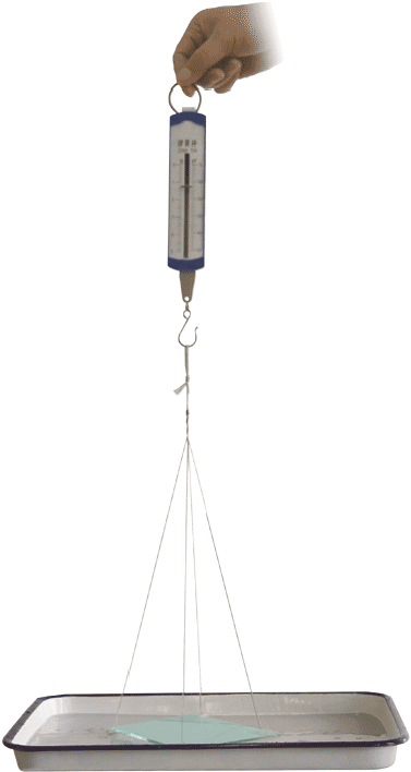 (2)将洗净的玻璃板用弹簧测力计吊起来,使玻璃板水平接触水面,然后缓慢竖直上拉。观察弹簧测力计的示数变化,看看在将玻璃板拉离水面的过程中,拉力的变化(图 1-6)。
