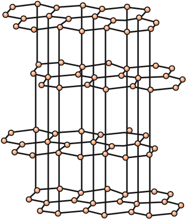 同种物质微粒在不同的条件下有可能生成不同的晶体,虽然构成这些晶体的物质微粒都相同,但是由于它们的排列形式不同,物理性质也不同。金刚石、石墨都是由碳原子构成的晶体,但是它们的物理性质有很大差异。金刚石晶体中的每一个碳原子周围都有四个碳原子,它们彼此之间的距离相等,且有很强的相互作用力(图 2-11)。金刚石是自然界中硬度最大的物质,可用来切割玻璃,能钻透坚硬的岩层。金刚石几乎不导电。石墨晶体中的每一个碳原子同相邻的四个碳原子之间的距离不相等,呈明显的层状结构,每层中的碳原子都排成六边形(图 2-12)。由于层与层之间的距离较大,碳原子之间的作用力较弱,沿着这个方向很容易把石墨一层层地剥离。石墨较软,常用来制造润滑剂,铅笔芯的主要成分也是石墨。石墨有良好的导电性。